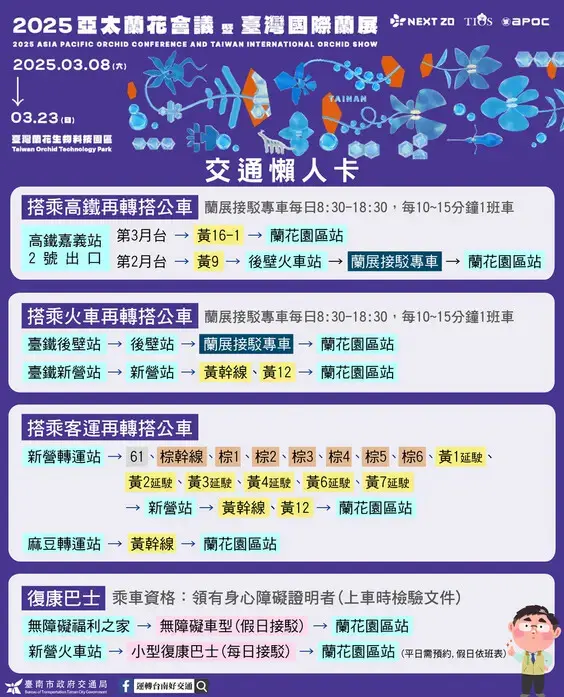 - 地點:臺南市後壁區蘭花生物科技園區(臺南市後壁區長安里烏樹林325號)