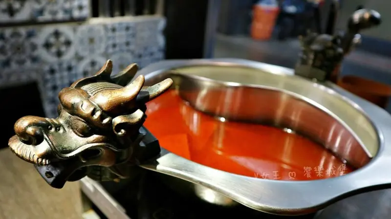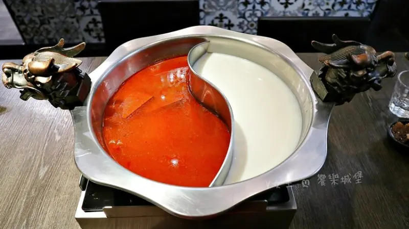 湯頭總共有四種可以選,分別是麻辣鍋、酸菜白肉鍋、香純牛奶鍋跟大骨湯。我這次選的是麻辣鍋小辣加上香純牛奶鍋。你看這個鍋子是不是超級霸氣,兩邊都是龍頭的造型,光看就覺得很厲害。