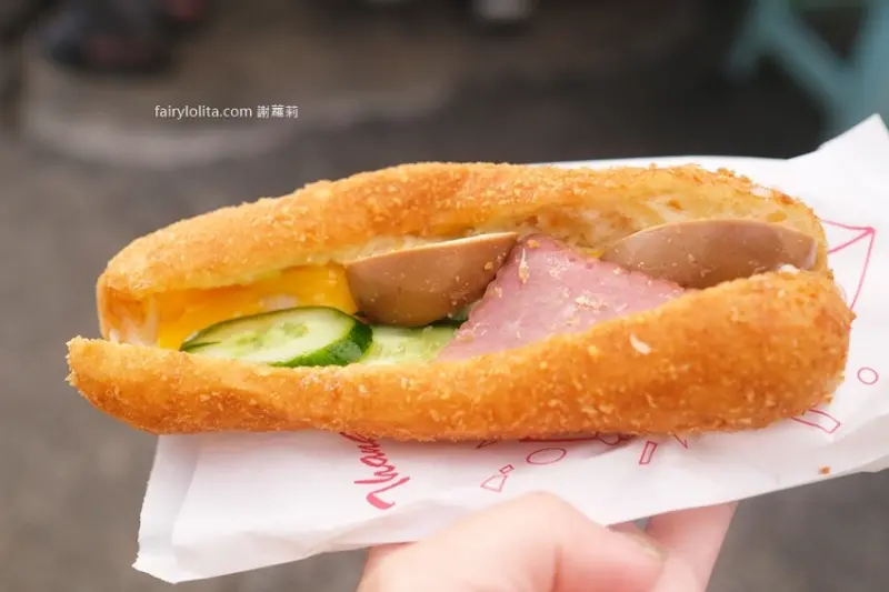 「展記三明治」的麵包皮是屬於比較傳統式的,外層灑了厚厚的炸粉,看起來還挺美味的。