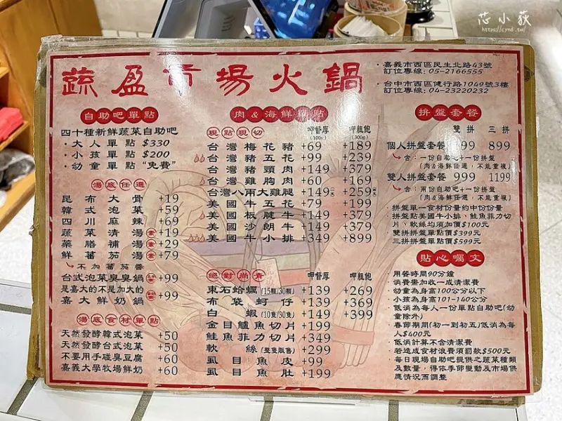 蔬盈市場火鍋四十種新鮮蔬菜自助吧單點大人 $330,小孩 $200 (身高101-140公分),幼童 (身高100公分以下)免費,有八種湯底任選,肉品單點100g跟300g自由搭配,用餐時間90分鐘,消費需加收一成清潔費,低消為每人一份單點自助吧。