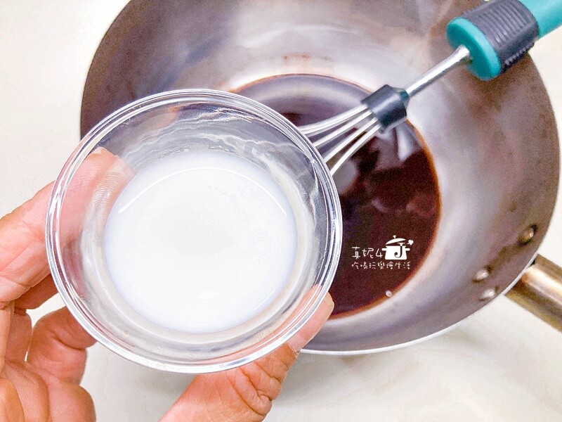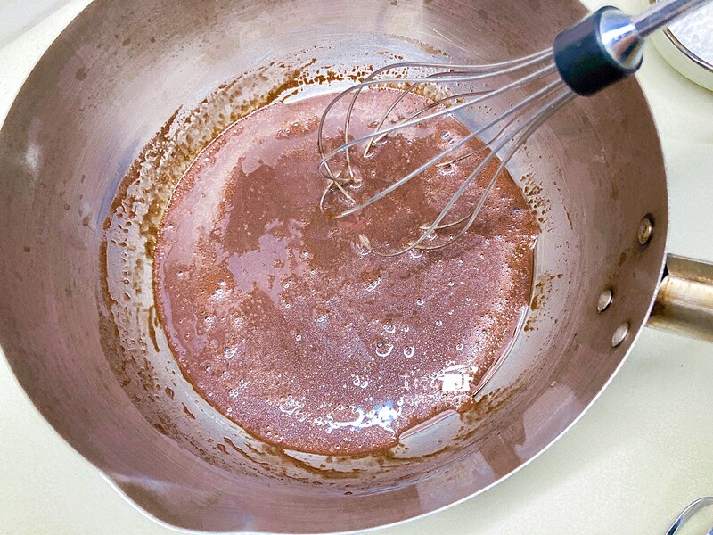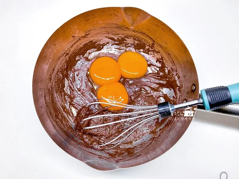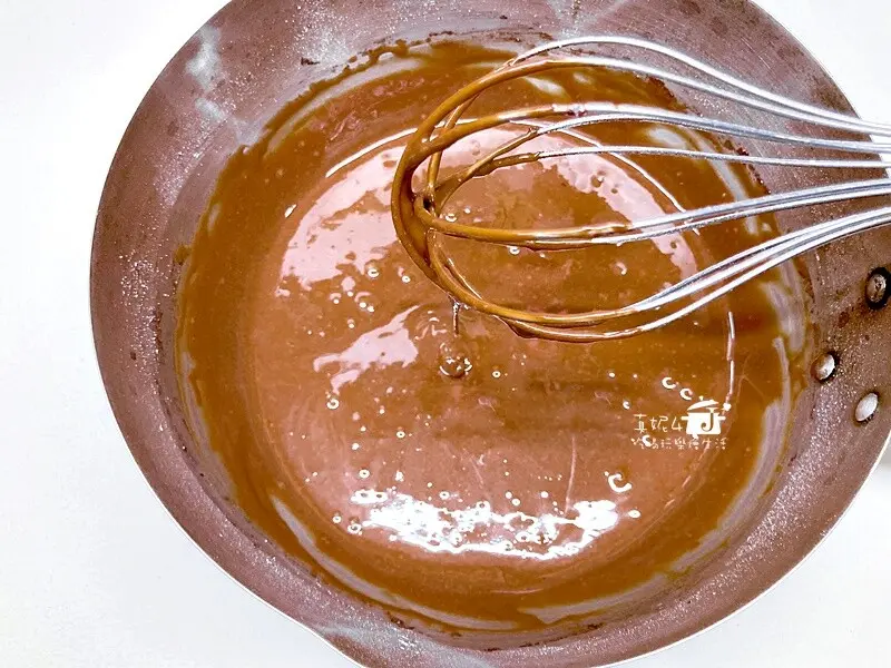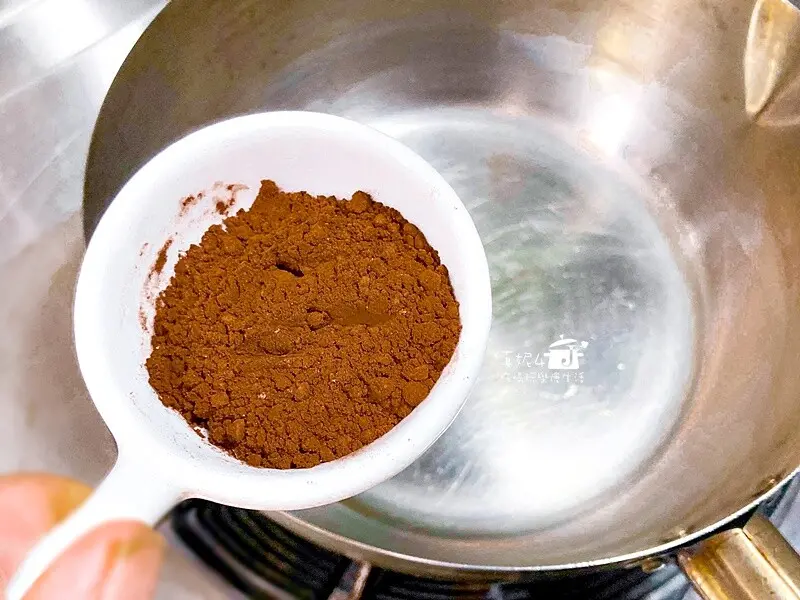 鍋裡用小火加熱沙拉油到出現紋路後熄火,倒入可可粉拌到沒有顆粒