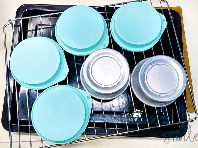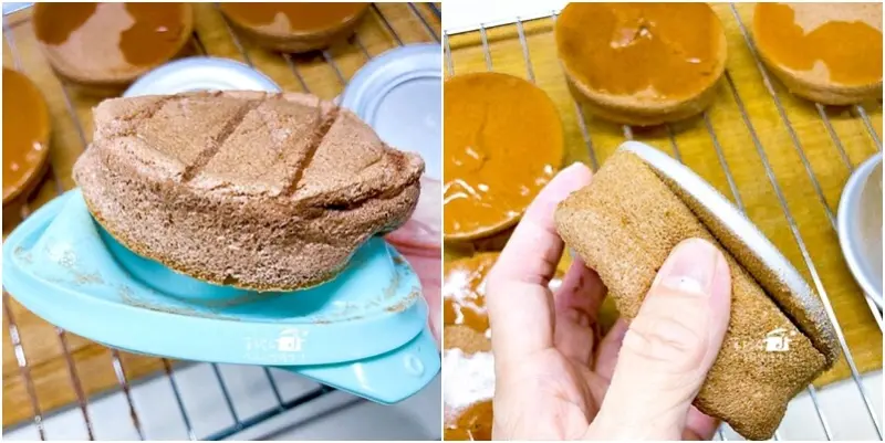 左邊是不沾烤右邊是活動烤模,烤成功的戚風蛋糕都能安全脫模