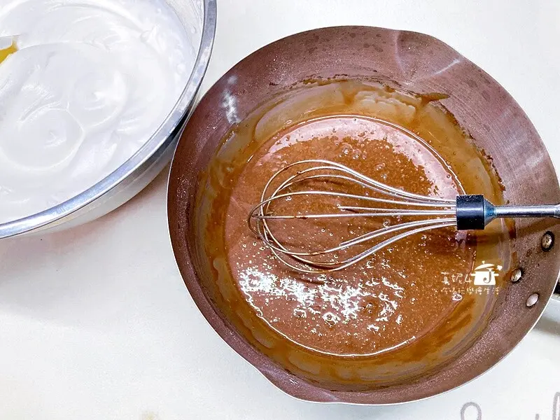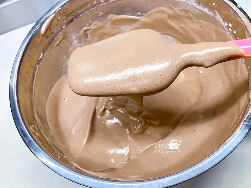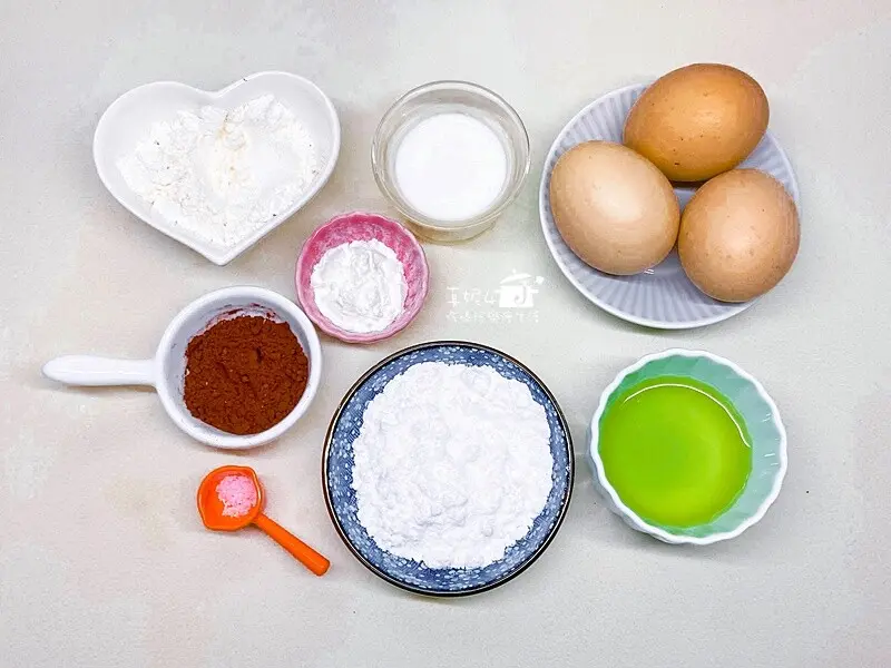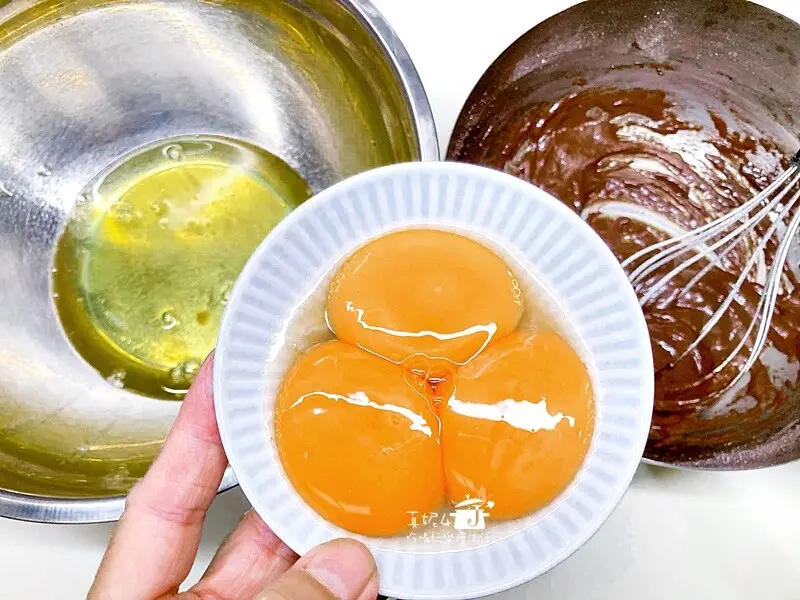 蛋黃糊:蛋黃3顆,牛奶30g,沙拉油30g,低筋麵粉25g,玉米粉5g,可可粉5g,鹽1g(可省略)
