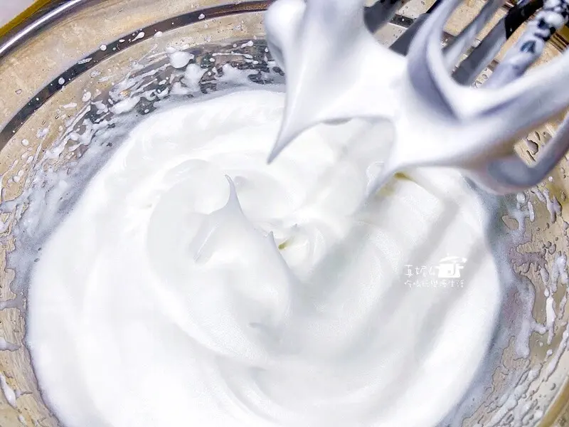 糖量不多就把糖粉一次性加入蛋白裡,先高速打到出現紋路後轉中速打到能拉出彎鉤的乾性發泡