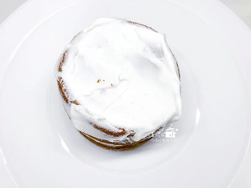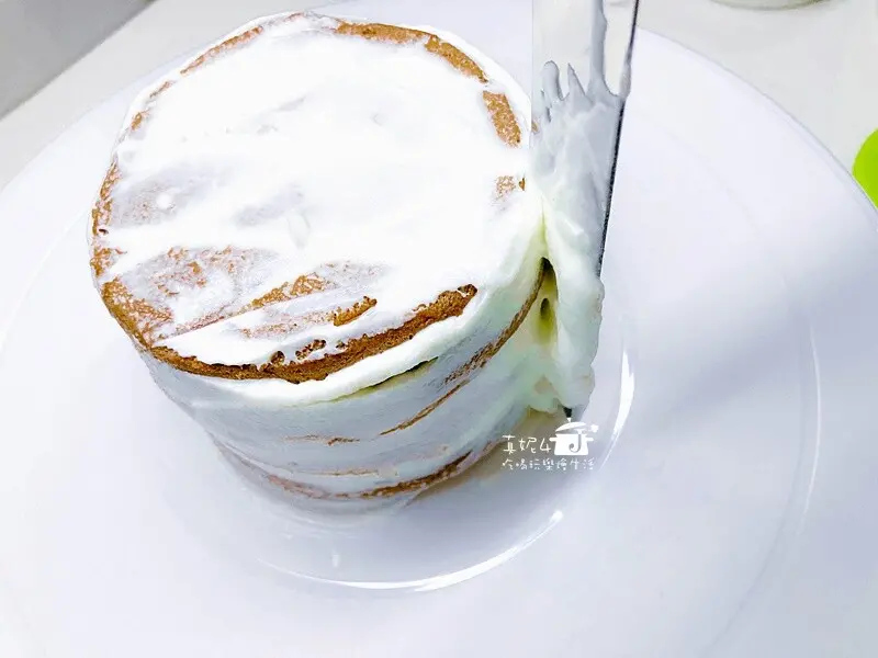 最後在圓周及頂上再薄抹一層奶油霜,用抹刀收邊。完成後的蛋糕胚要放冰箱最少30分鐘