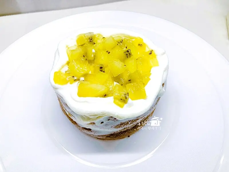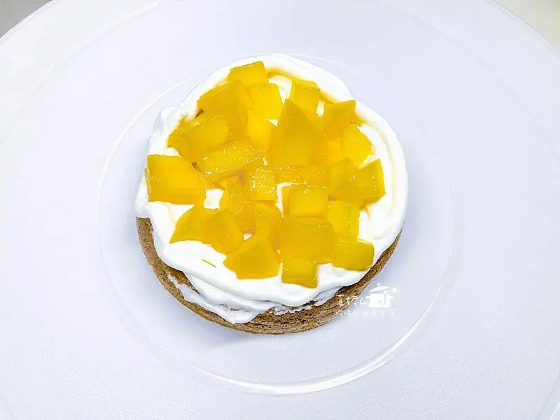 取一片蛋糕先薄抹一層鮮奶油,在頂上擠一圈製造高度填入水果丁後蓋上另一片蛋糕
