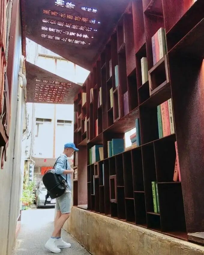 在老街的巷弄裡將康灩泉、陳志謙等頭城文學家的小說佳句、動人詩詞文字以鋼雕鏤刻呈現,部分用隧道的方式呈現出來,陽光灑落下來,將這些詩詞作品的倒影投射於牆面,畫面看起來很有文學氣息。另一側的牆面設計有如大型書櫃,正好呼應這些文學作品。