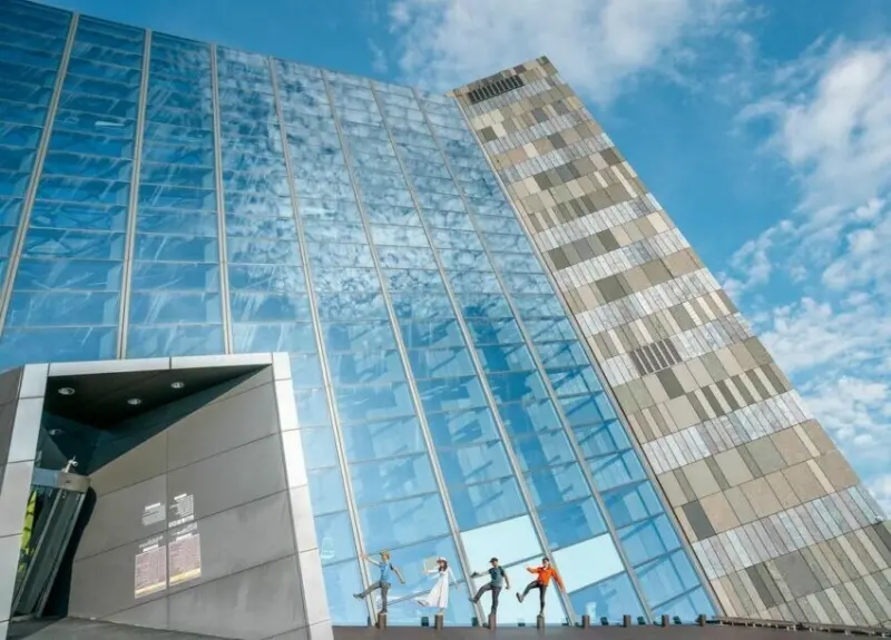 外型如同一座山的蘭陽博物館,座落在熱門的烏石港旁,宛如宜蘭地景的縮小版寫照,外牆的玻璃反射著藍天白雲,在宜蘭難得的晴天裡,這裡就是民眾拍照打卡的最佳景點,再進到博物館大廳,半空中的天空步道,則是另一個網美必拍之地。