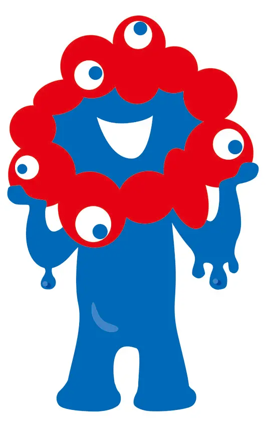 吉祥物「MYAKU-MYAKU脈脈」的 MYAKU就是脈搏,是生命本身的本質。 以連續的「脈」命名,意味著我們人類的DNA、智慧、技術、歷史和文化,一直不斷地(MYAKU-MYAKU)」脈脈相傳。脈脈的紅色部分是可以分裂和增殖的細胞,藍色部分是乾淨的水。角色可以自由變化,擁有無限可能,將繼續傳承人類的奇蹟。