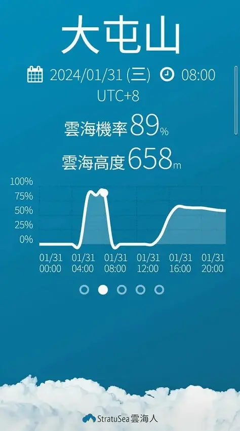 可參考大屯山雲海高度及機率(硬漢嶺高度約600m)