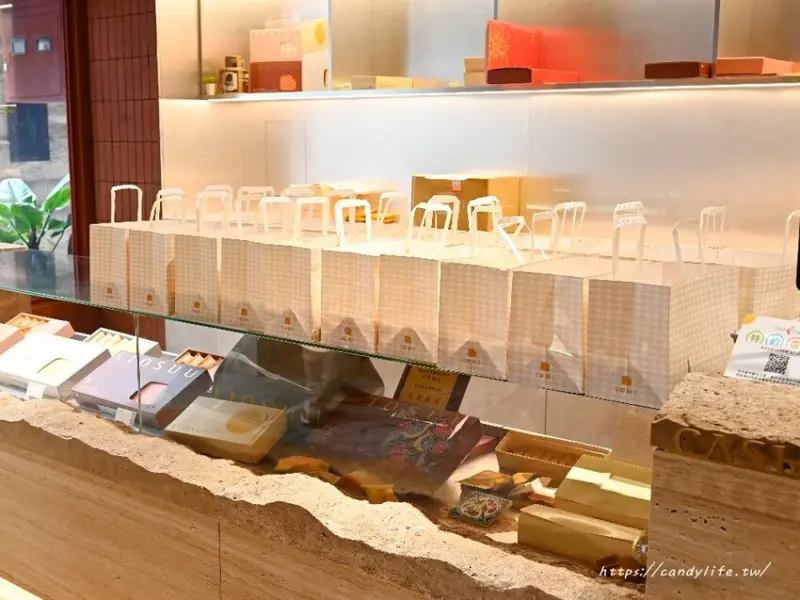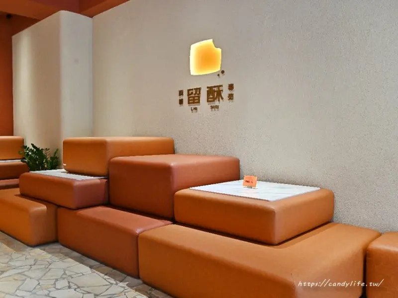 留酥店裡頭裝潢非常有細節,地面呈現鳳梨酥的碎屑感,一旁休息區以堆疊的鳳梨酥為概念,讓大家可以在這裡休息品嚐美味糕點