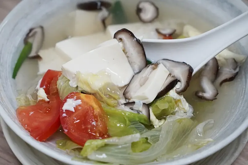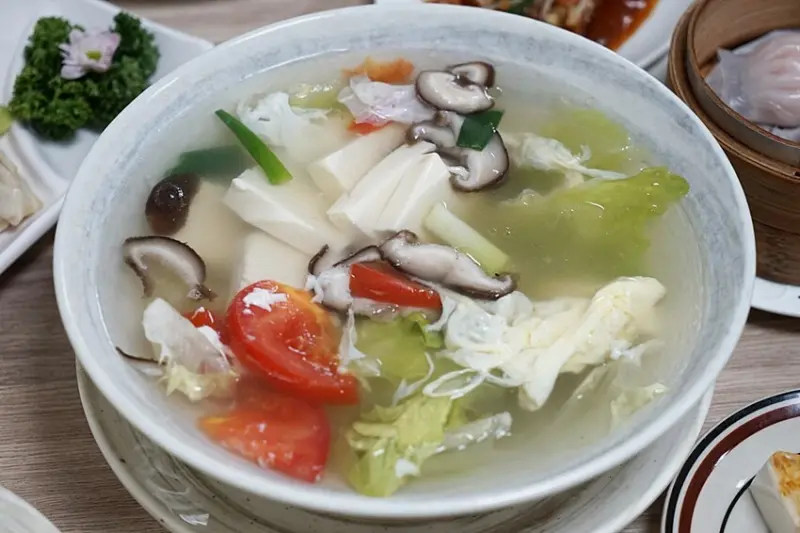 四喜湯就是湯頭比較清爽、但料很豐富的湯品。內有番茄、香菇、豆腐、大陸妹以及雞蛋等,幾乎是吃料為居多,但因為湯頭比較清淡來搭配我們的熱炒嘟嘟好。
