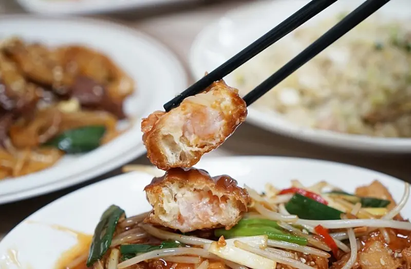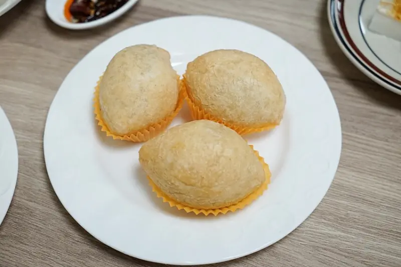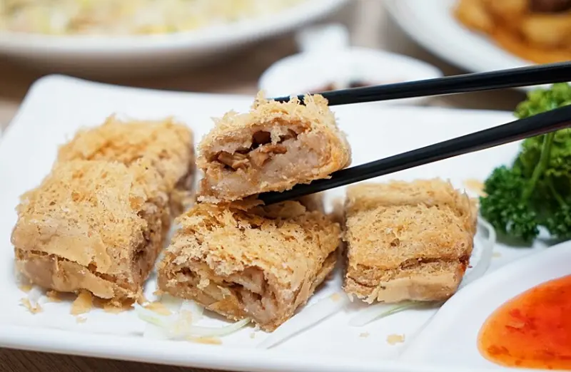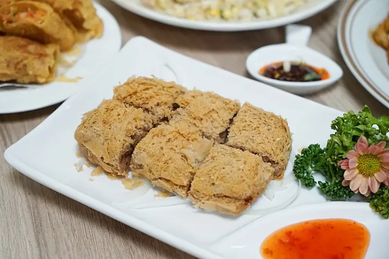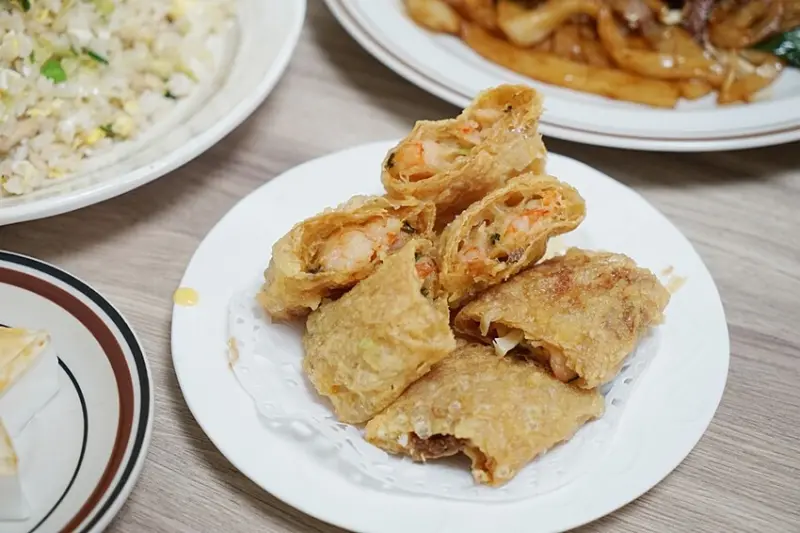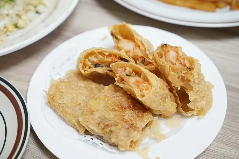 鮮蝦腐皮捲。有著金黃腐皮薄而酥脆,豆香味滿溢口中,加上內餡飽滿,且還能吃到完整的蝦肉,沾上店家附上的醬汁更是清爽不油膩。