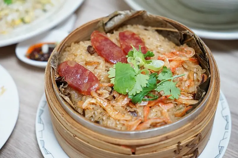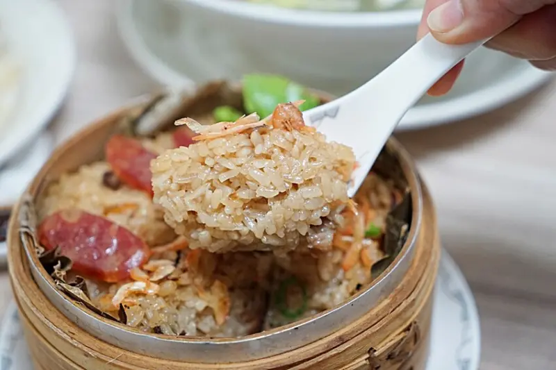 櫻花蝦米糕,米糕上除了櫻花蝦以外,還有臘腸、香菇等,並以荷葉來包裹蒸熟帶著淡淡的清香。