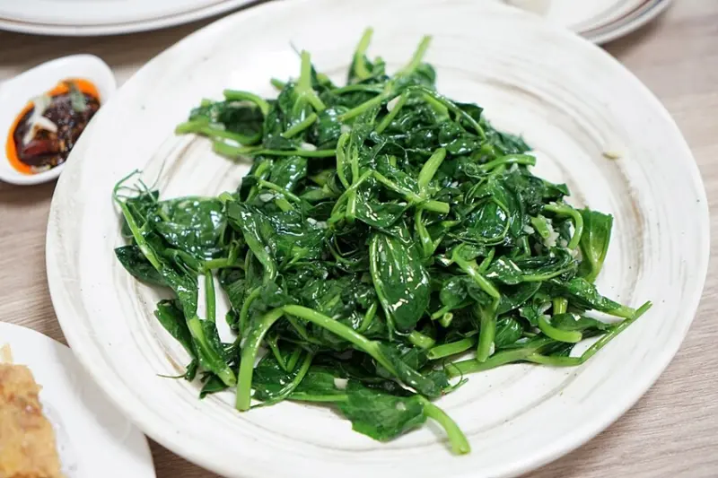 清炒豆苗。平常不易見的豆苗這次一看到,姊妹就說必點且老闆訂的價格也親民,因為光這盤在某餐廳就要價3、4百元囉!以大火快炒的手法守住豆苗的清脆,加上蒜香讓豆苗獨有的清香更明顯,立馬又收服姊妹的胃啊!