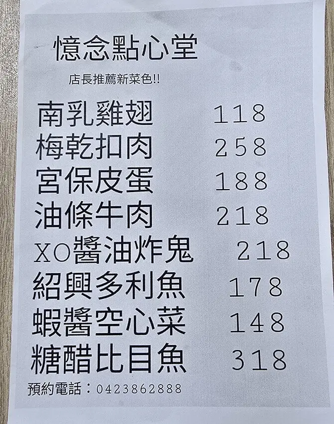 憶念點心堂菜單,以特色料理、麵飯、熱炒、功夫菜、港式料理、點心為主,料理非常適合一家大小、公司行號、朋友來用餐,就算一個人來也能開心點餐喔!而且通常餐廳都是提供商業午餐、這邊卻有商業晚餐,7種主食搭上三種小菜以及白飯(可內用、或外帶),目前店內也有提供外送(提早預訂以便安排、金額請自行電話詢問),並搭配Uber eats外送平台。