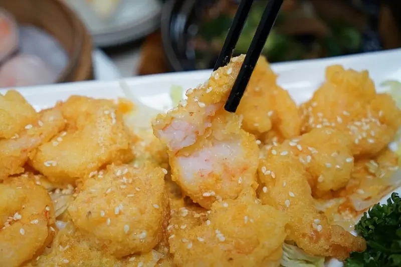 金沙鮮蝦球,將整尾白蝦裹粉炸至呈金黃且香氣散出,再均勻沾裹炒成糊狀的金沙,就是道大人小孩最愛的熱炒海鮮。