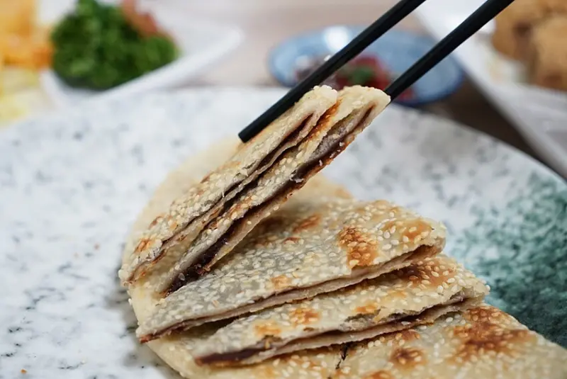 紅豆沙鍋餅外層的芝麻撒上不少,那芝麻香氣我超愛!酥香帶點Q軟的餅皮加上內餡紅豆綿鬆不甜膩好好吃,這不管是正餐或飯後甜點來吃都很涮嘴,重點沒有我擔憂的油耗味,且冷熱吃都沒問題!