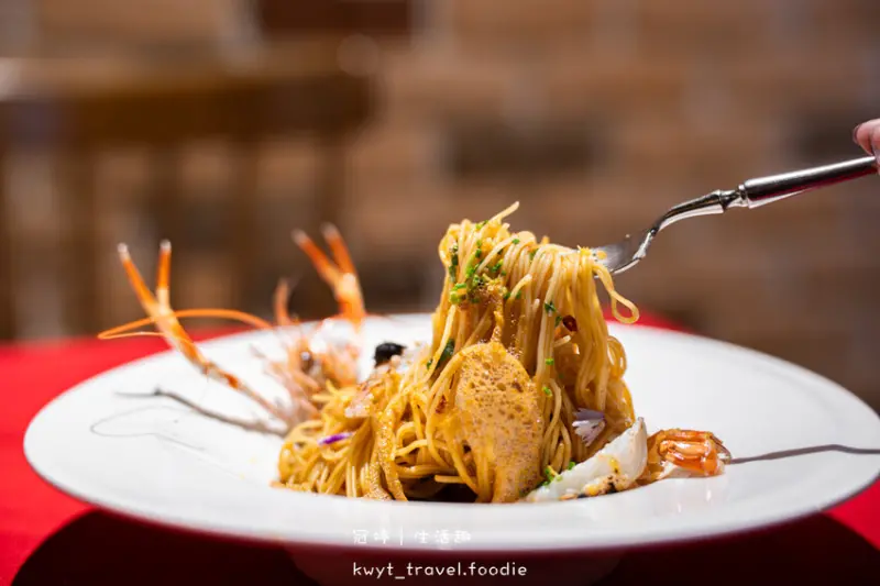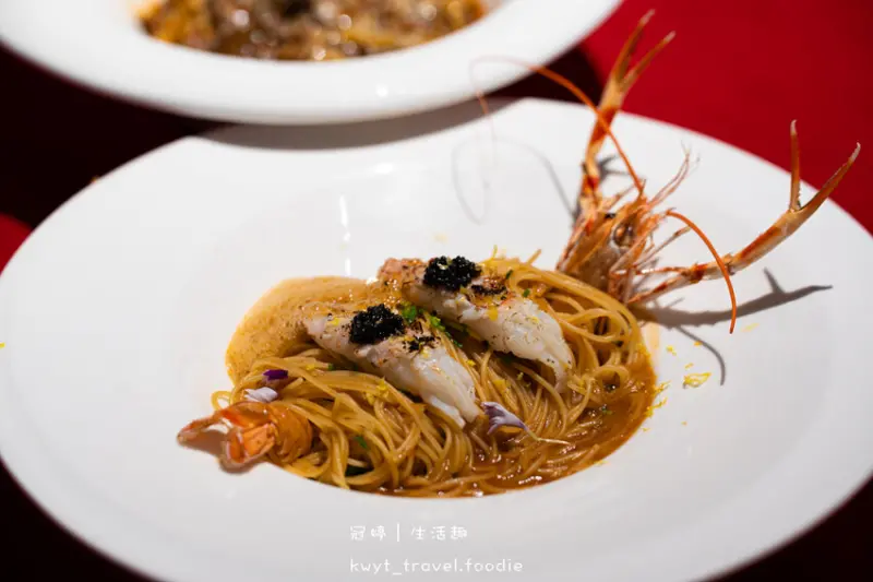 料理過程中加入自帶獨特鮮香的蟹膏炒製天使麵,享用前拌入蝦膏泡泡增加入口吃到的鮮味厚度,一口軟Q天使麵,接著吃一口肉質脆甜的角蝦肉,好滿足。