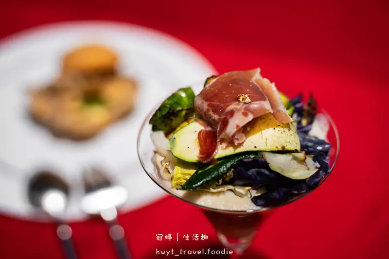 鹹香生火腿搭著用炭火烤過自帶獨特焦香的甜脆蔬菜,加點口感綿密的甜香蘋果花椰菜泥,整體層次豐富、清爽不厚重,很適合當開胃菜享用。