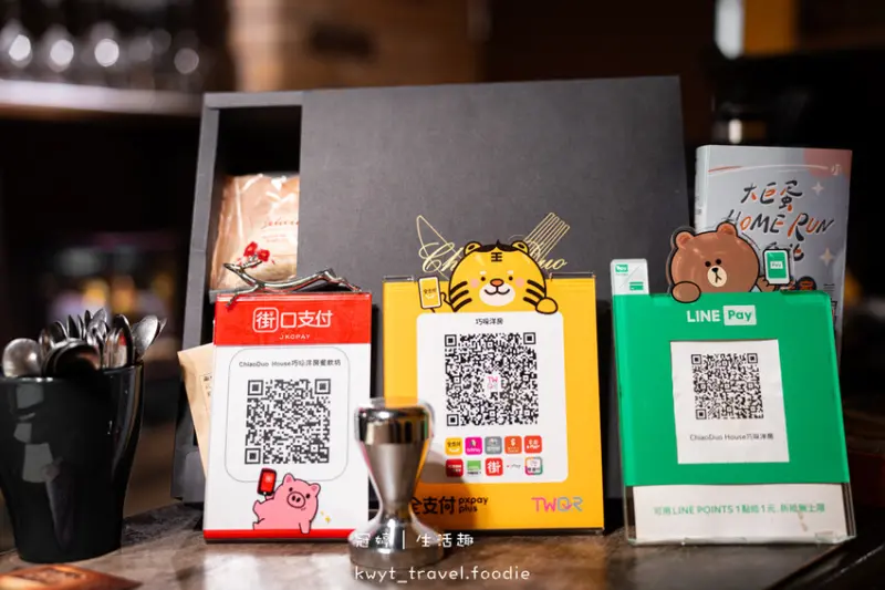 在巧哚洋房用餐、外帶餐點,可使用現金、LinePay、街口支付、全支付、台灣Pay、橘子支付、ipassmoney、icashpay、悠游付、歐付寶等多元方式付款結帳。