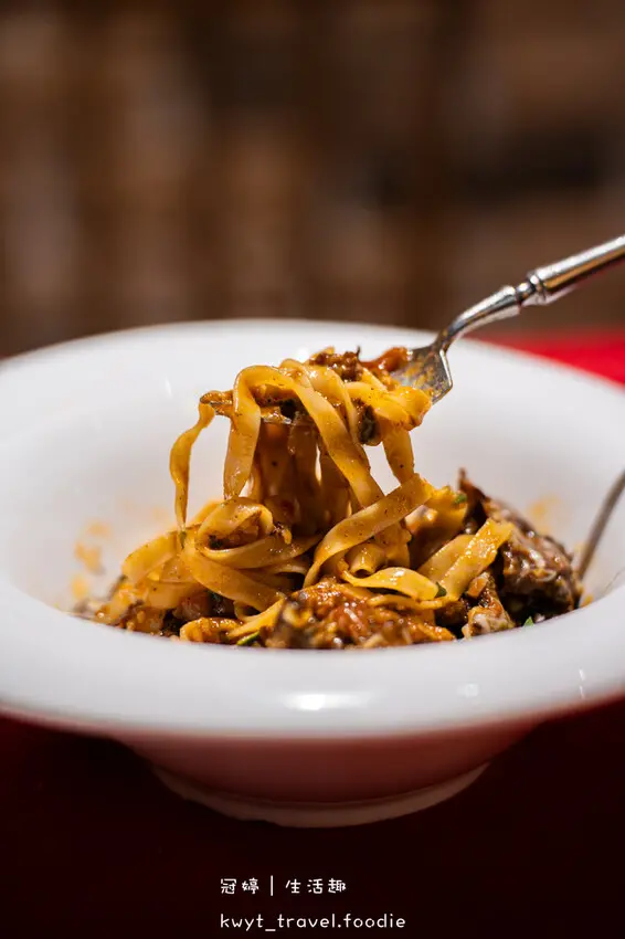 以山豬肉為主角,添加紅酒、洋蔥、胡蘿蔔、芹菜等食材堆疊香氣層次,經過火侯時間淬鍊成就的厚工好味鳥巢麵。