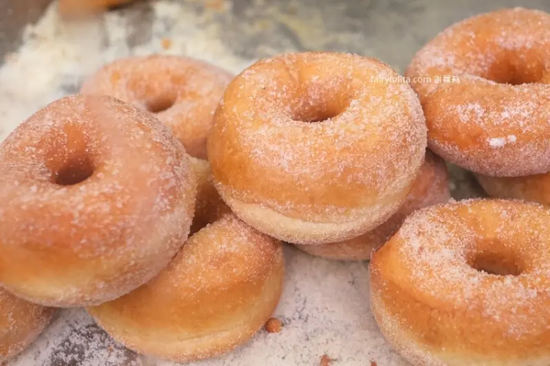 出爐的甜甜圈還沾上不少糖粉,吃起來更有味道。