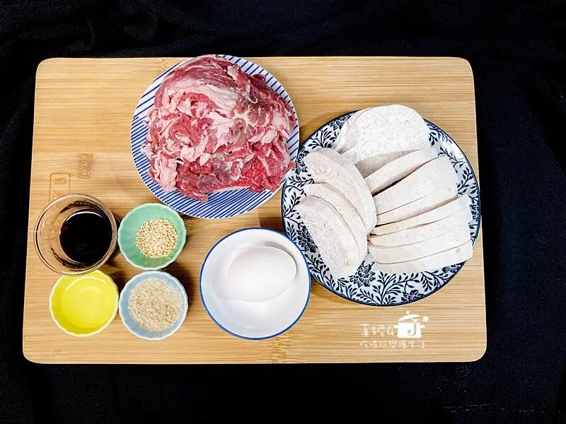 做法3.靜置後的牛肉片拌勻太白粉後平舖在蒸熟的芋頭片上