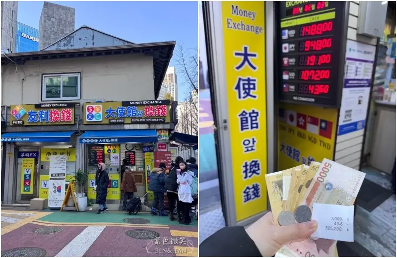明洞總共有三間熱門的換錢所,第一推薦匯率最好看的明洞大使館換錢所,其他兩間都在明洞大使館旁,營業時間09:00–21:30,拿護照和新台幣給櫃檯,現金點收正確無誤、拿到收據明細就可以離開。