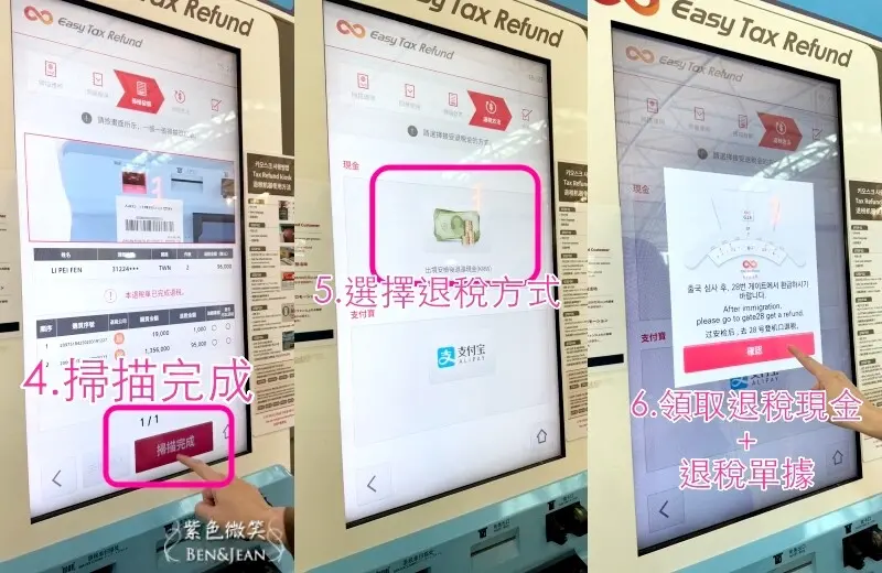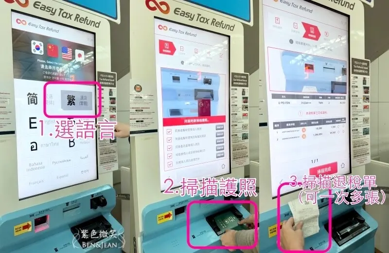 - 掃描護照→掃描退稅單(可多張)選擇退稅方式(建議選擇現金退稅)→領取退稅現金+退稅單據。