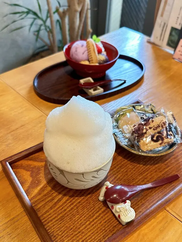 我們額外點了紫芋甜點,有紫芋做成的冰淇淋、紅豆、傳統餅、白玉、鮮奶油,冰淇淋吃起來不太甜,有滿滿的紫芋香氣,其他配料對我來說比較偏甜