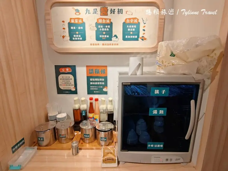 醬料跟餐具在出餐區的後面,上面還有寫著「九是醬好初」店家推薦的搭配方法,大家可以參考看看。