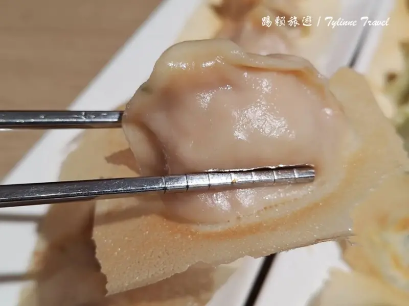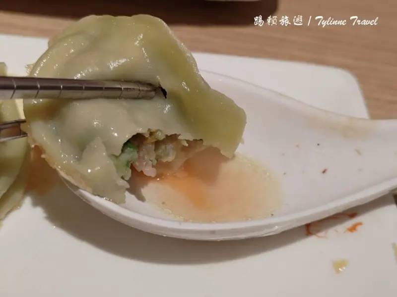 第二個是「韭菜鮮肉煎餃」,看顏色就知道裡面的韭菜放超多,咬下去,滿滿的韭菜香伴隨著肉香在嘴裡散開,嚼一嚼那個香氣還會一直留在嘴裡,很久都不會散掉,而且因為他們的煎餃裡面都有加特製的「皮凍」,加熱後就會變成湯汁,倒在湯匙裡面就可以看到滿滿的湯汁流出來。