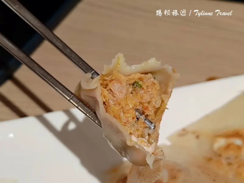第一個吃的是「韓式泡菜煎餃」,底部的麵衣皮是帶點金黃色的焦色。煎餃本身超飽滿的,感覺稍微用力捏裡面的餡料就會爆出來。咬下去一口,泡菜的酸辣味馬上衝出來,外皮酥脆,內餡又飽滿,吃起來超級過癮。