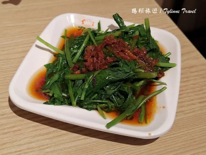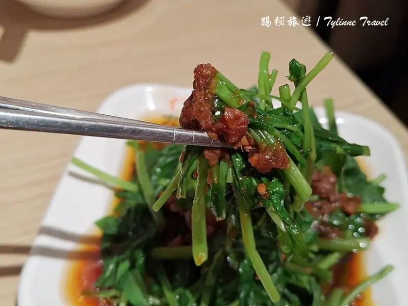 當天的青菜是「空心菜」,上面有加一點滷汁增加風味。空心菜非常新鮮,吃起來爽脆又多汁,搭配滷汁跟滷肉一起吃,更香更好吃。