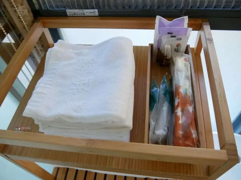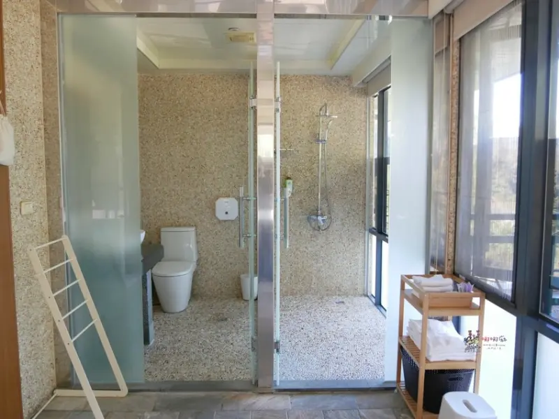 旁邊有放一點簡單的備品,像是毛巾、洗衣籃之類的,還貼心放了個小凳子,如果不方便站著洗也可以拿凳子進去坐。