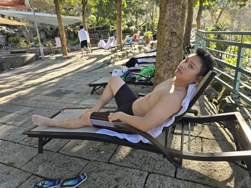 泡得太熱想休息的話,旁邊有躺椅可以躺著稍微休息聊聊天,我覺得很可以在這裡待蠻久的,泡一泡累了就上來享受群山環繞的舒適,過一會兒再下去泡。