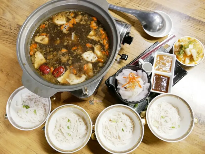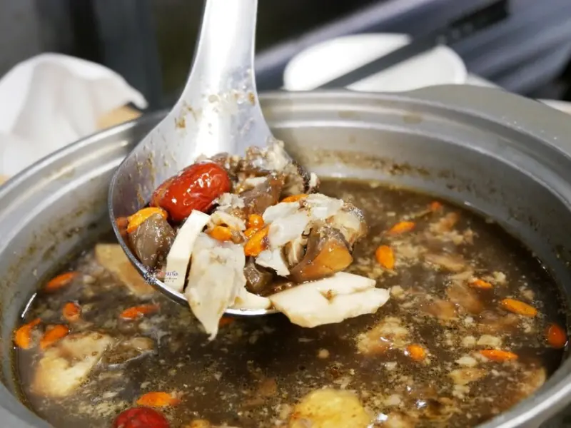 主餐是用中藥材加上鱘龍魚煮的膠原藥膳鍋,鱘龍魚本身富含膠原蛋白,可以吃到牠們軟骨QQ軟軟像是吃牛筋一樣的口感。