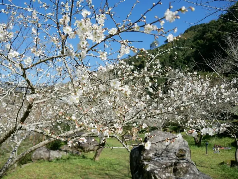 湯館前有梅園、櫻花園和吊橋,除了泡湯之外還可以走走逛逛賞花。