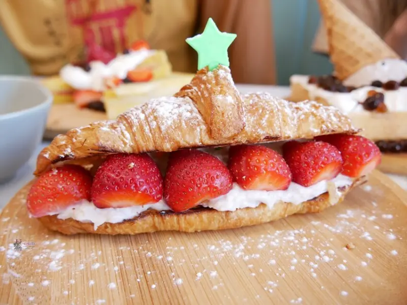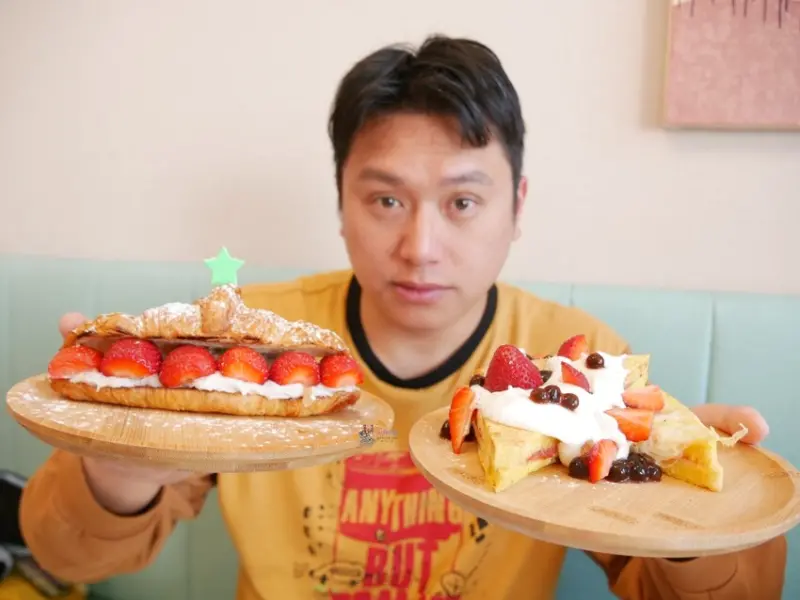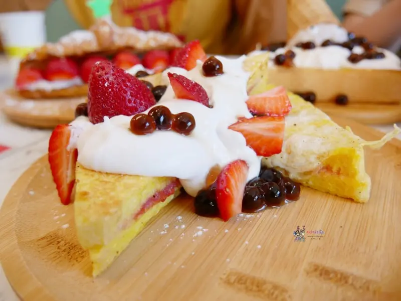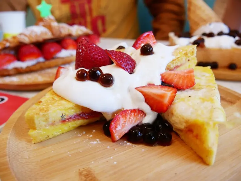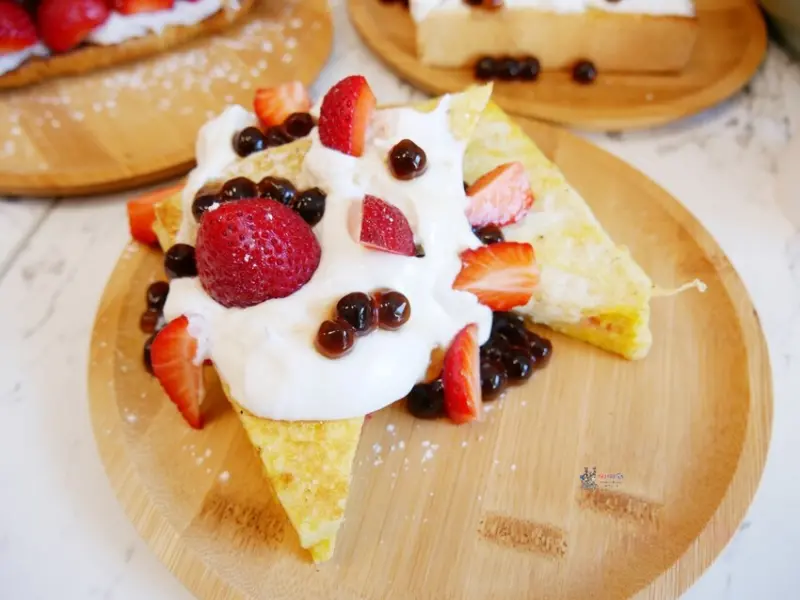 這又是一道用了奶蓋的餐點,法式吐司中間抹草莓醬,外層在裹上蛋液去煎,本身就已經蠻有特色了。再加上奶蓋和草莓,另外還有QQ軟軟的珍珠,就視覺上來說也是挺豐富的。
