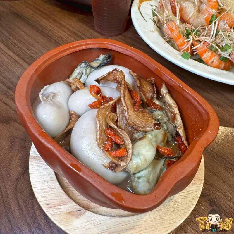 蛋蛋豬寶盒(350元)有肥美的鮮蚵、大顆的雞佛,搭配麻油、薑片和枸杞燉煮,吃完真的好補喔 XD