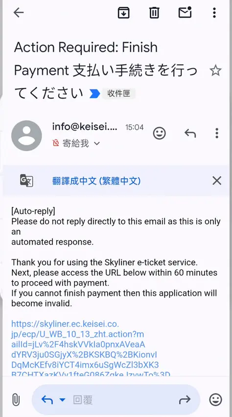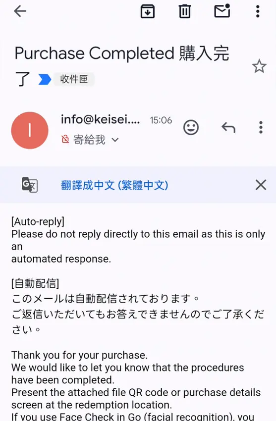 ▲接著馬上會收到一封信,主旨是「購入完了」,就表示購買成功囉!直接開心的去機場就可以了!