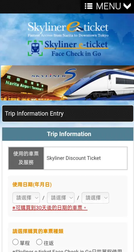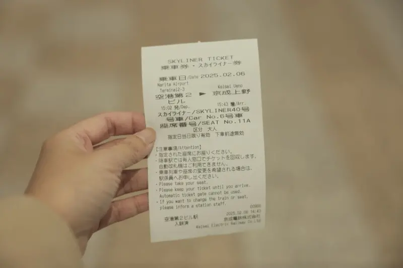 下飛機後直接走京成電鐵的票口(藍色的有寫Skyliner),走中間有一台小螢幕的那條走道,臉靠近刷一下就可以了,然後在票口會出一張紙本車票給你,上面會寫你的班次、車廂號碼、跟座位號碼。
