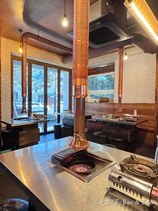 室內設計融合了韓國傳統與現代工業風,使用木質桌椅與金屬元素,給人一種溫暖又時尚的感覺。