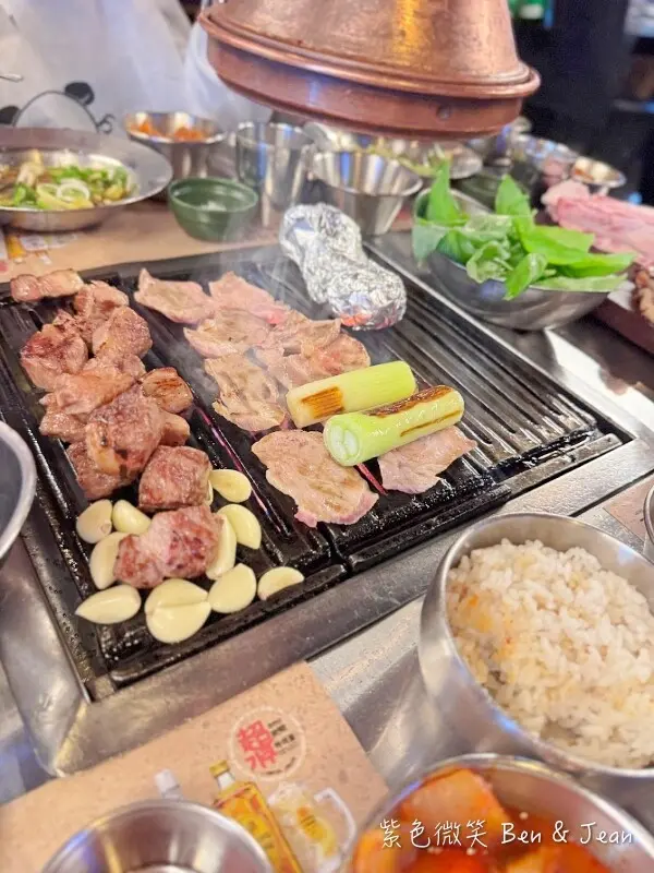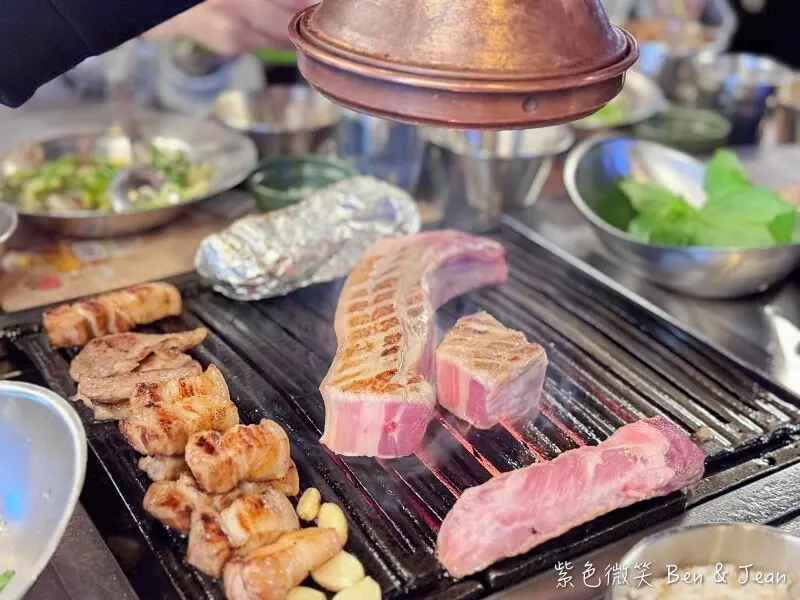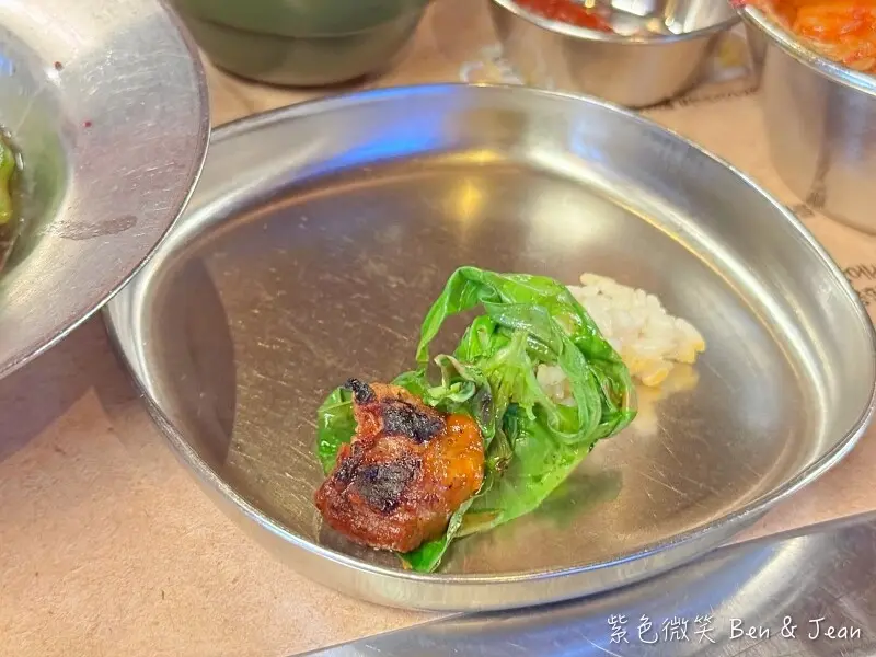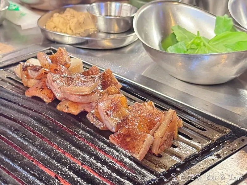 烤至微焦時最佳,搭配醬料或生菜包肉更添層次。(店員幫忙配菜)