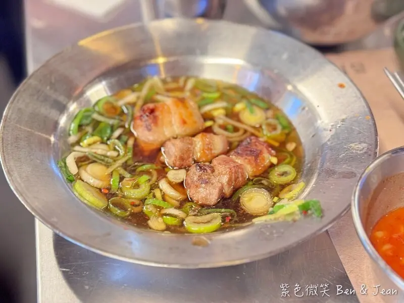 洋蔥醬油(양파 간장소스): 清爽的洋蔥絲泡在醬油中,微酸微甜,搭配油脂豐富的五花肉特別解膩。