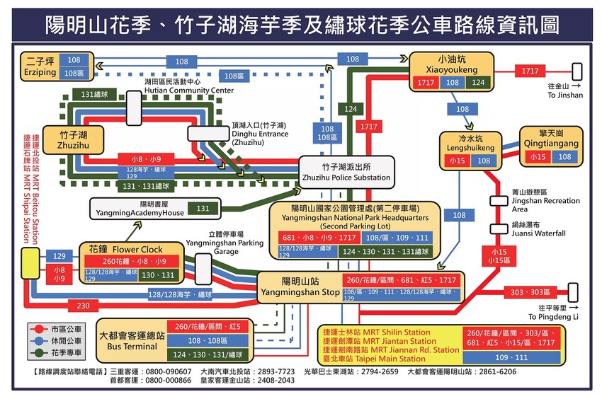 另外這張看起來格外複雜的,就是陽明山花季的公車路線圖。紅色的是市區公車,藍色的是休閒公車,綠色的則是花季專車;如果怕塞車不想開車的人,這張就是很實用的公車路線參考圖👍