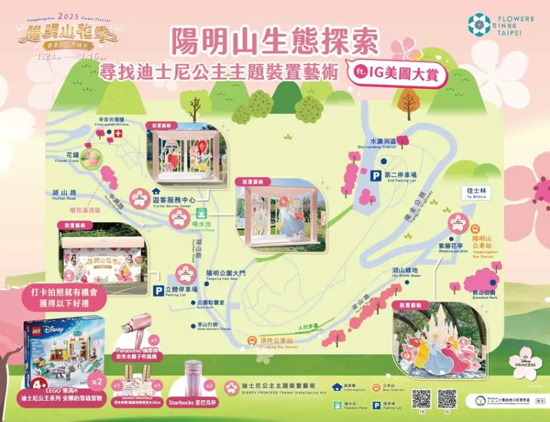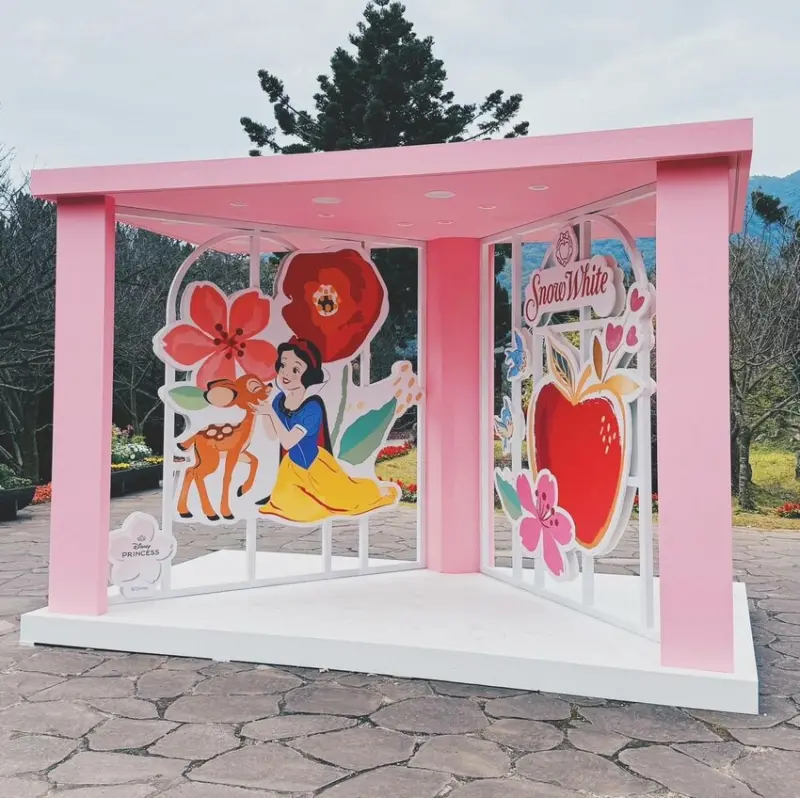 為了讓賞花能增加更多趣味性,2025陽明山花季還特地規劃出迪士尼公主為主題的裝置藝術,讓大家在賞花之餘還能來跟迪士尼公主們合照,順便上傳打卡,就有機會獲得各項好禮喔!(以下圖片皆取自官網)