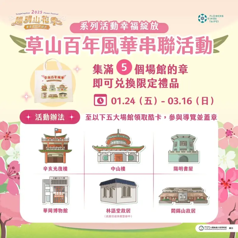 2025陽明山花季除了IG美圖大賞外,另外還能參加這個草山百年風華串聯活動,只要到辛亥光復樓、中山樓、陽明書屋、華岡博物館、林語堂和閻錫山故居五大廠館領取酷卡,參與導覽並蓋章,集滿5個館場的印章,就有機會兌換限定禮品。看來2025陽明山花季不僅噱頭多,對獎活動也多多,很適合安排一場春日踏青之旅喔!