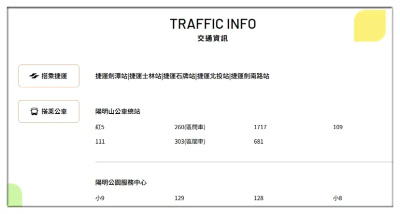 這裡有前往陽明山的交通資訊,包括可下車的捷運站,和可以搭乘上陽明山的公車🚌